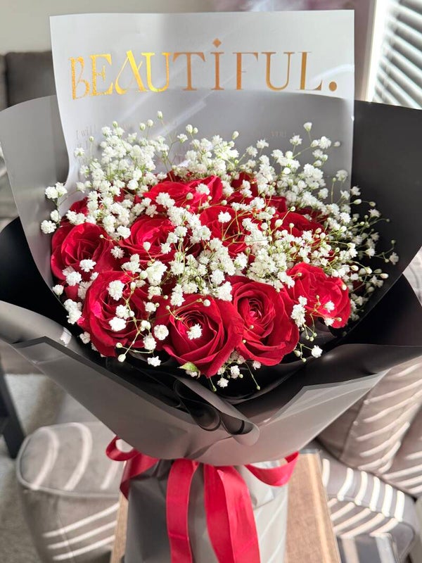 12 classic red roses paired with delicate baby’s breath and a heartfelt letter, elegantly wrapped in sleek black paper for a timeless and romantic touch