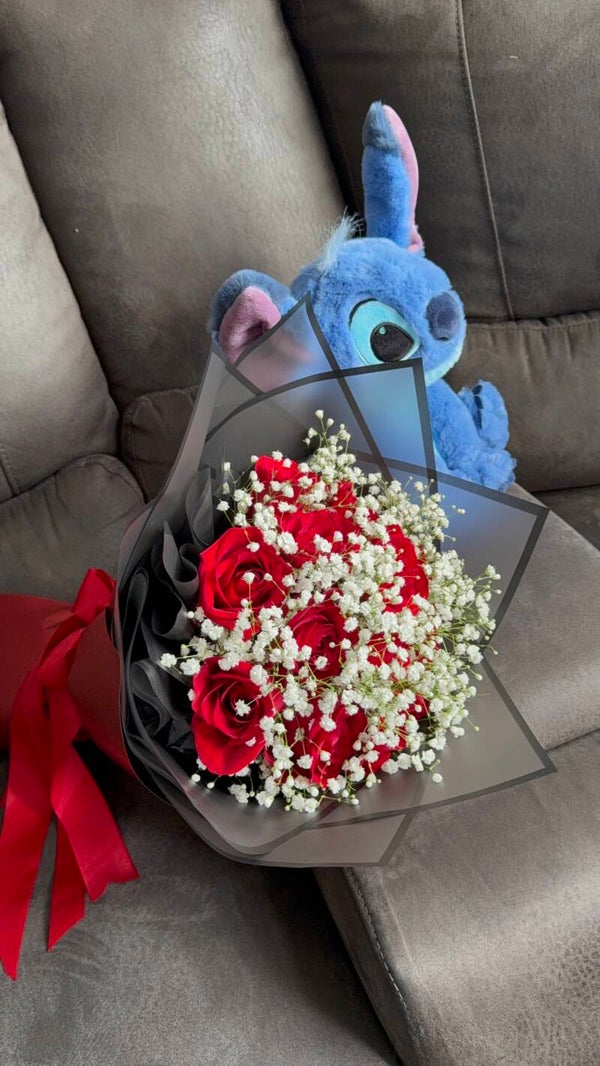 A dozen romantic red roses with baby’s breath, paired with an adorable blue Stitch. Perfect for any occasion
